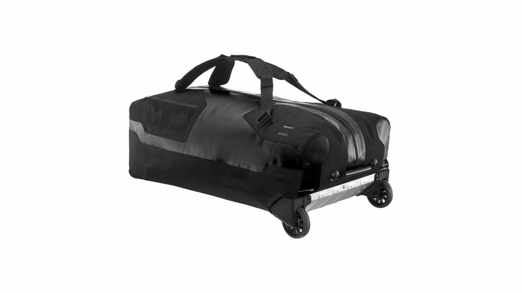 Die Duffle RS verbindet hohen Reisekomfort mit den extremen Ansprüchen an Expeditionstaschen. Für die erhöhten Anforderungen im Heavy-Duty Einsatz wurde ein Rollensystem entwickelt, das wasserdicht in den Taschenkörper integriert ist. Die 100 mm großen Rollen bieten zusammen mit der versteiften Bodenplatte aus profiliertem Aluminium optimale Bodenfreiheit – ideal abseits befestigter Wege. Da leichtgewichtiges Gepäck insbesondere bei Flugreisen eine wichtige Rolle spielt, wurde bewusst auf ein schweres Teleskopgestänge verzichtet. Stattdessen kommt ein längenverstellbarer Griff zum Einsatz, der komfortables Hinterherziehen mit hoher Beinfreiheit garantiert. Die vollflächige Schaumpolsterung am Taschenboden bietet beste Stabilität bei Vollbeladung. Schnellen Zugriff auf die Ausrüstung ermöglicht der über die ganze Länge der Tasche verlaufende, wasserdichte TIZIP-Reißverschluss (überarbeitete Version), der mit Hilfe des integrierten Drahtbügels und eines kleinen Kabelschlosses (nicht enthalten) verschlossen werden kann.