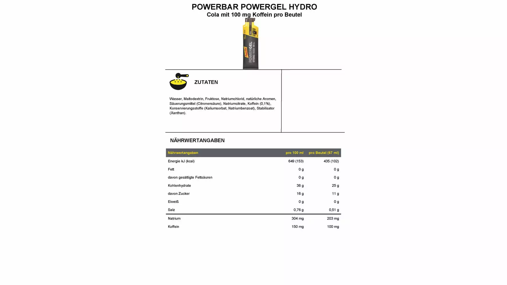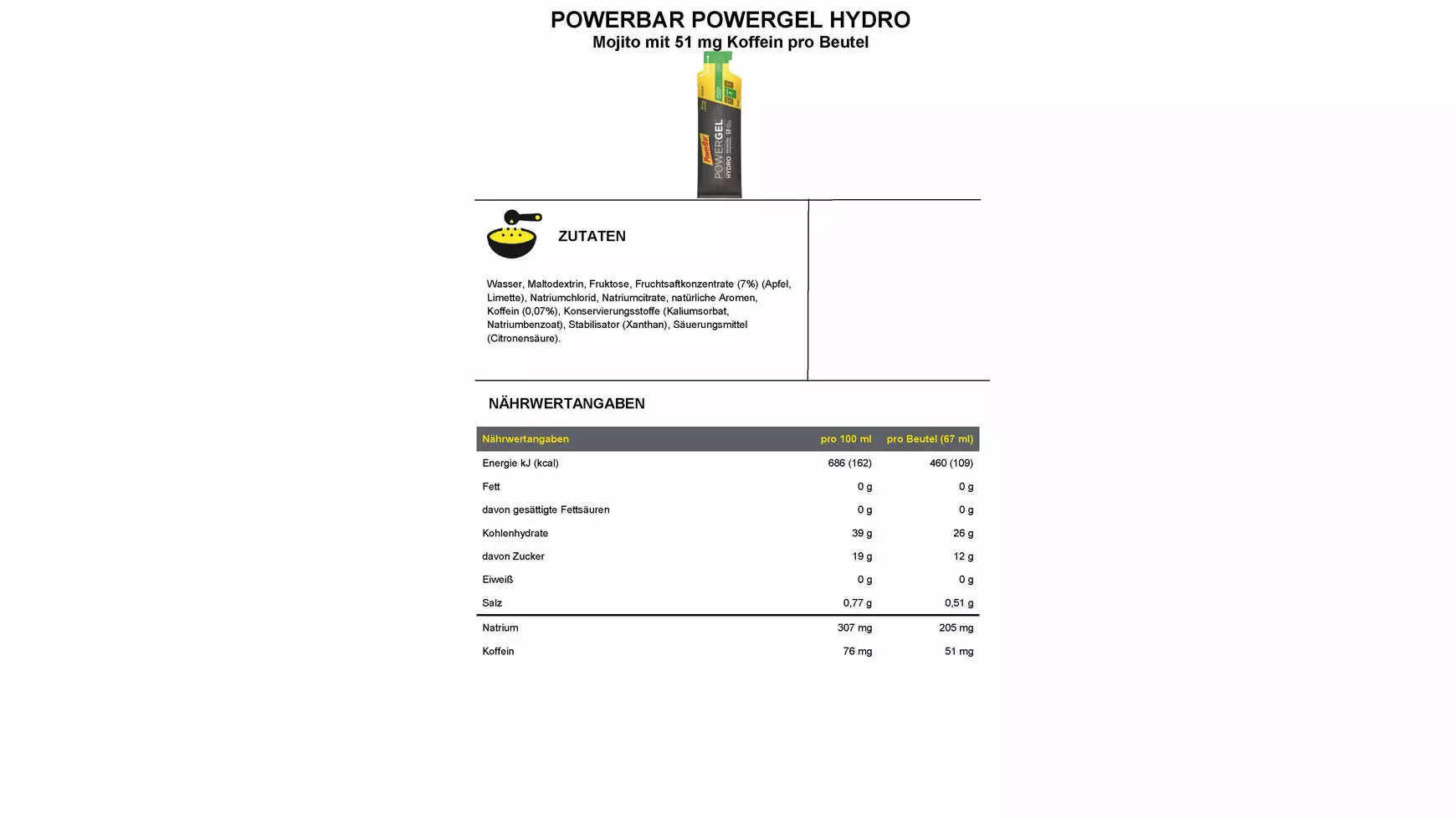 Während der letzten Stunde hast du alles gegeben und willst jetzt nochmal ein PowerGel® bei dem kein zusätzliches Nachtrinken notwendig ist? Dann solltest du das PowerBar PowerGel® Hydro probieren. Durch C2MAX liefert es dir Kohlenhydrate in einem wissenschaftlich entwickeltem 2:1 Verhältnis von Glukose- und Fruktosequellen. Die flüssige Konsistenz des Gels lässt sich leicht schlucken und erfordert somit kein direktes Nachtrinken, wie bei anderen Gelen. Ideal für Läufer oder für Sportler die gerne eine flüssigere Gelvariante bevorzugen. Die Zutaten und Nährwerte finden Sie unter den Detailbildern.